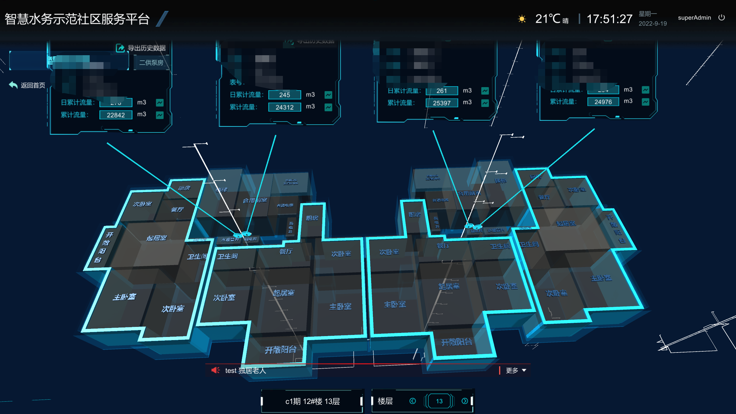 社区供水管理是指平台可以为供水管理人员提供基础信息如用水户信息,设备及管网静态信息等,同时提供各种数据监测,管网流量、压力、水质、井盖、二供泵房机组工况等,通过实时数据进行智能数据分析,包括爆管分析、漏损分析及定位、二供泵房低碳加压、输配水能耗分析、用水异常分析等。
