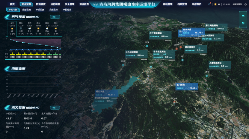 系统基于GIS地理信息使用高分卫星遥感技术,构建完整的以水库为中心的自然环境信息,以精确的三维模型全方位还原水库地势地貌,提供图层工具和空间服务等功能,实现三维可视化崂山水库孪生模型。