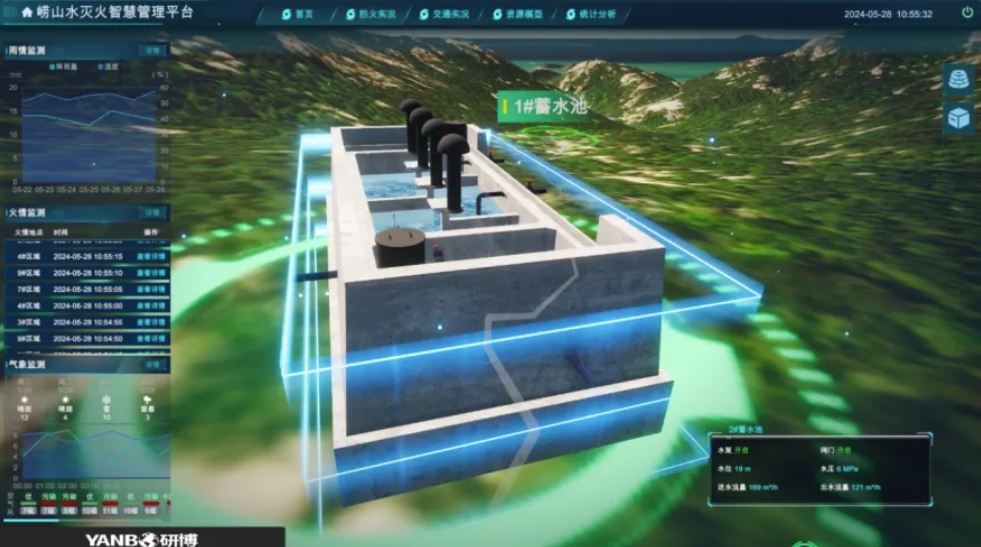 运行监测在三维模型基础上,通过面板展示雨情监测、火情监测和气象信息和报警记录四部分内容。