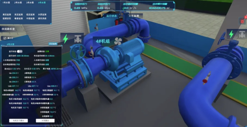 基于三维模型,展示泵站及机组、阀门运行状态、水位、水压、流量监测信息、设备运行详细状况以及现场视频信息。