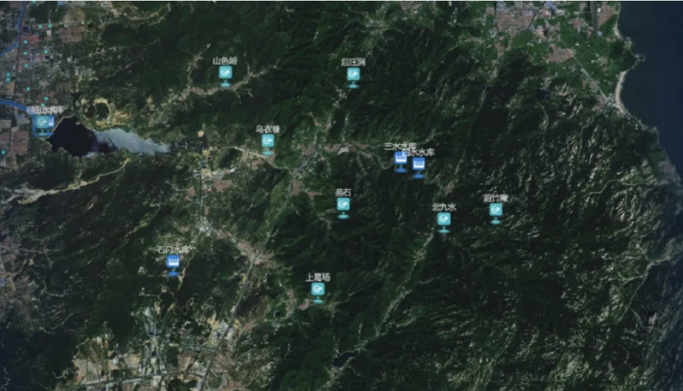 基于崂山景区GIS地图展示防灾物资分布情况和各个水池的分布及水量信息。